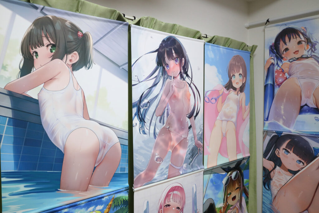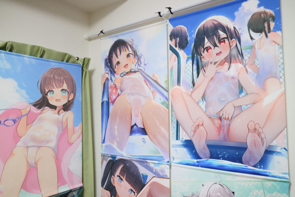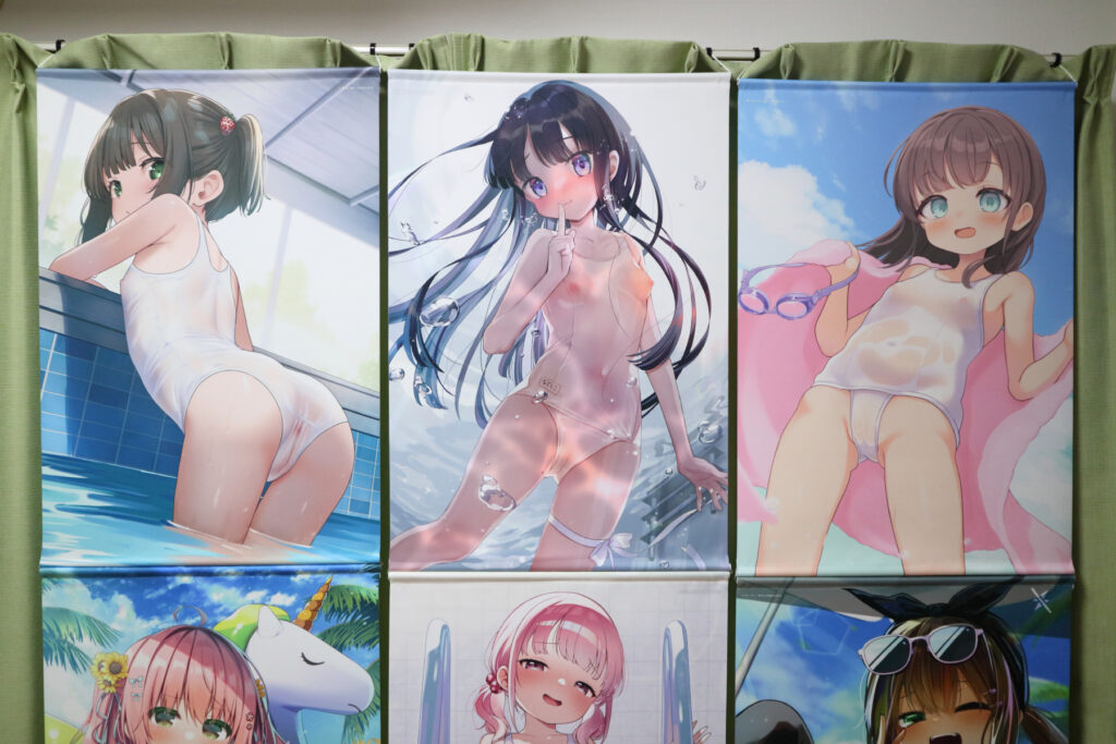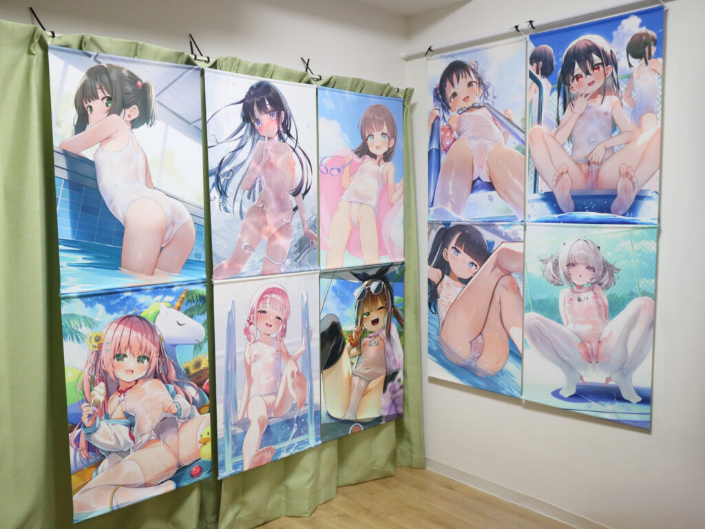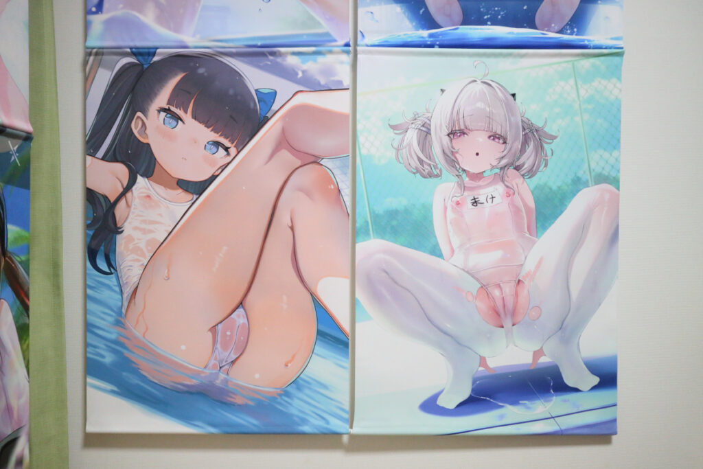 左はこたまちもさんのタペストリー。浅いプールに浸かりきらない大きめのおしりに、柔らかそうな太めの太ももがエッチエチ💖そして、水に濡れたスク水がぴたっと貼りついたこんもりなアソコがものすごーくエッ!です(≧□≦)!🔥❤️🔥❤️🔥