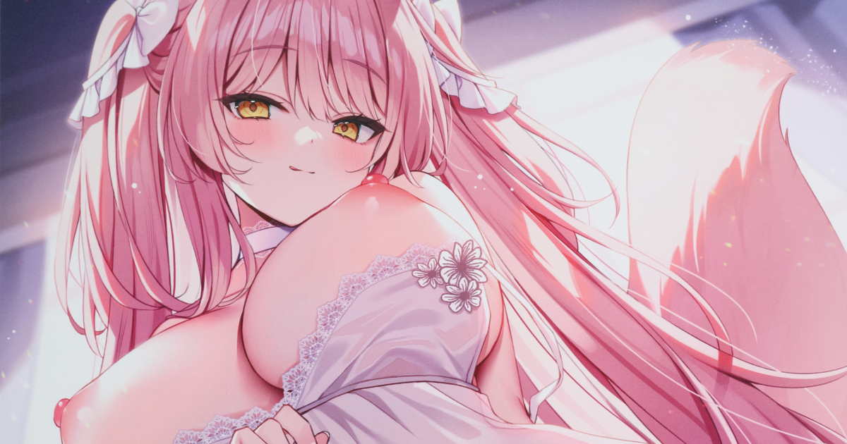 とってもセクシーなネグリジェ姿で目の前に立つケモミミっ娘ちゃん💕💕当時の商品紹介文ではお名前が書かれてはいませんでしたが、この長いピンクの髪にモフモフのしっぽと澄んだ黄色い瞳は、やたぬき圭さんの看板娘のみおりちゃんですね🎵