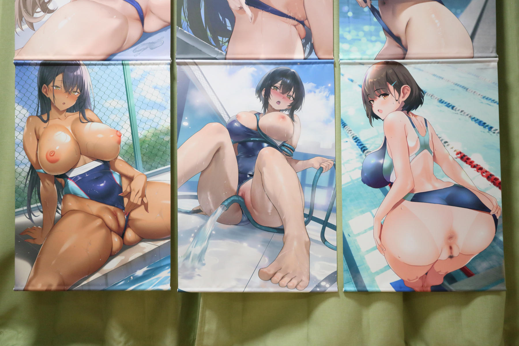 これだけ競泳水着の女の子たちを一度に飾るとさすがに壮観ですね~(*´ω`*)✨みんなおむねやアソコをポロリしちゃってホントにエッチです💕💕さてさて肝心のSUJIはどんな感じでしょうか💓💓