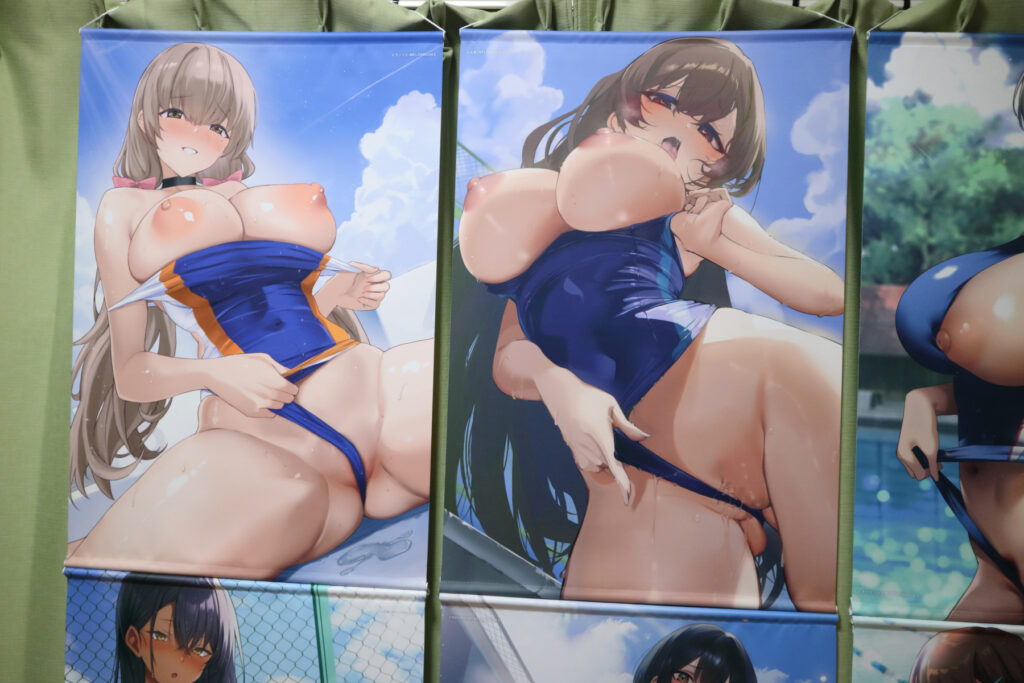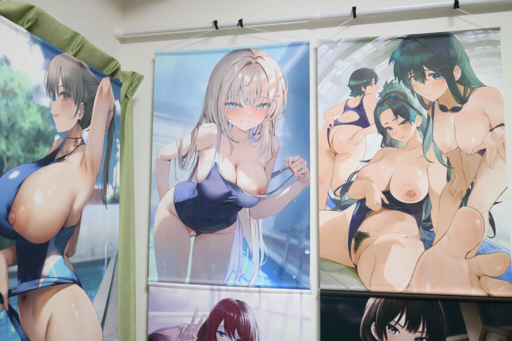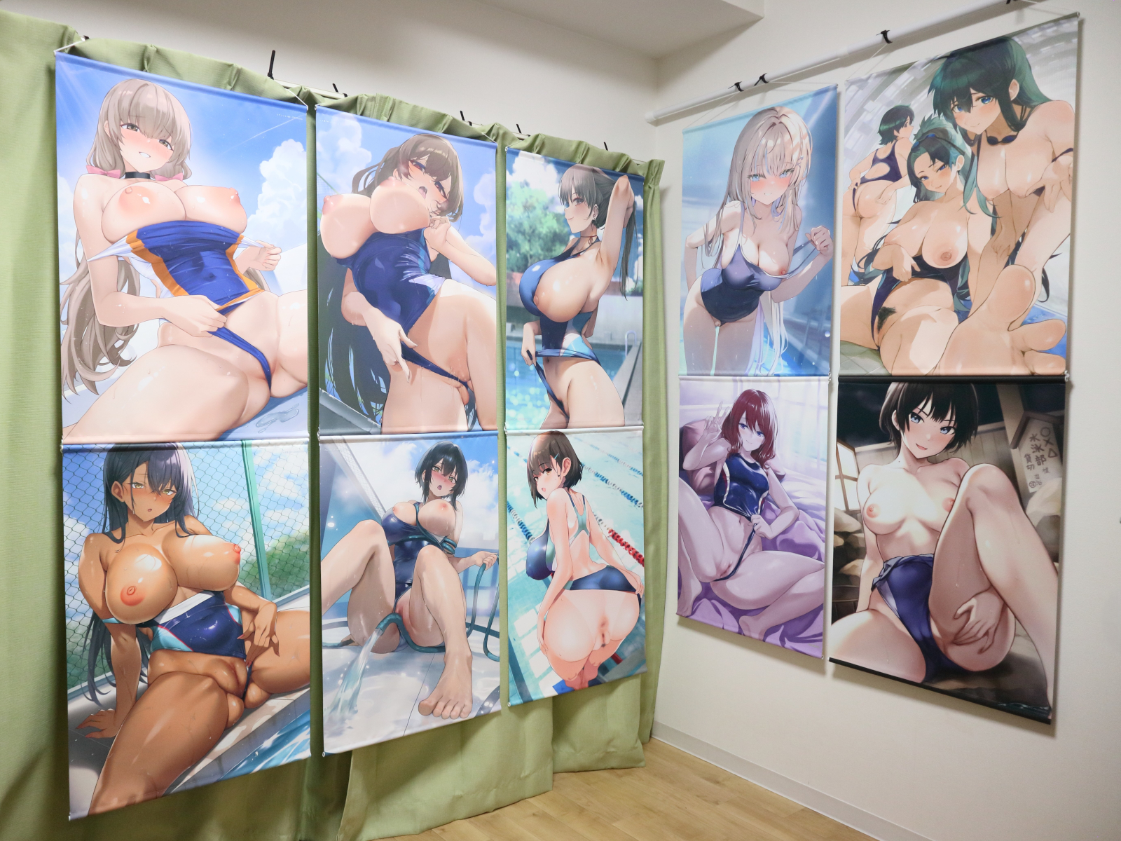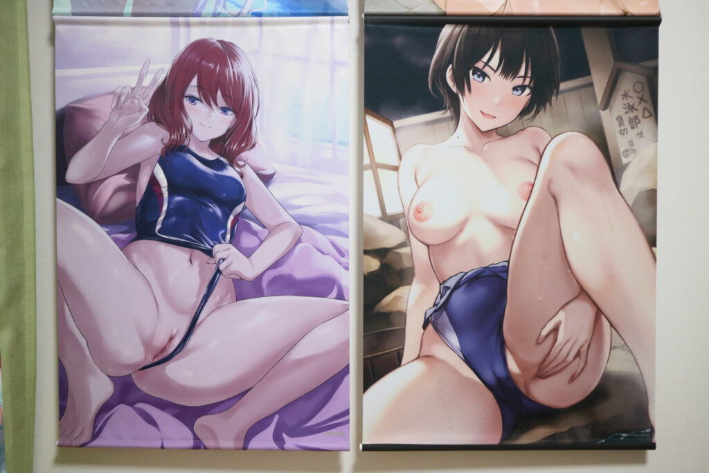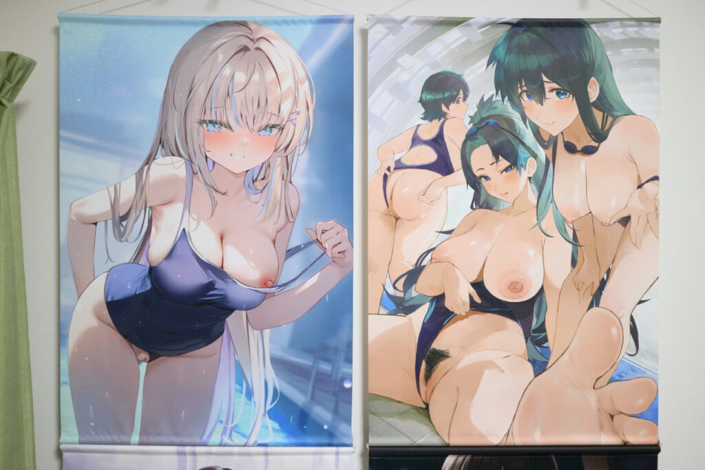 左が乱発さん、右がNeroMeloPさんの描き下ろしイラストのタペストリーです🧡🩵お2人とも股布部分がめくれちゃってるのは確認できますが、果たして・・・全体写真と局部アップを続けてどうぞ💨💨