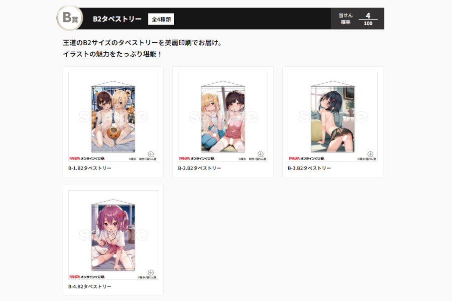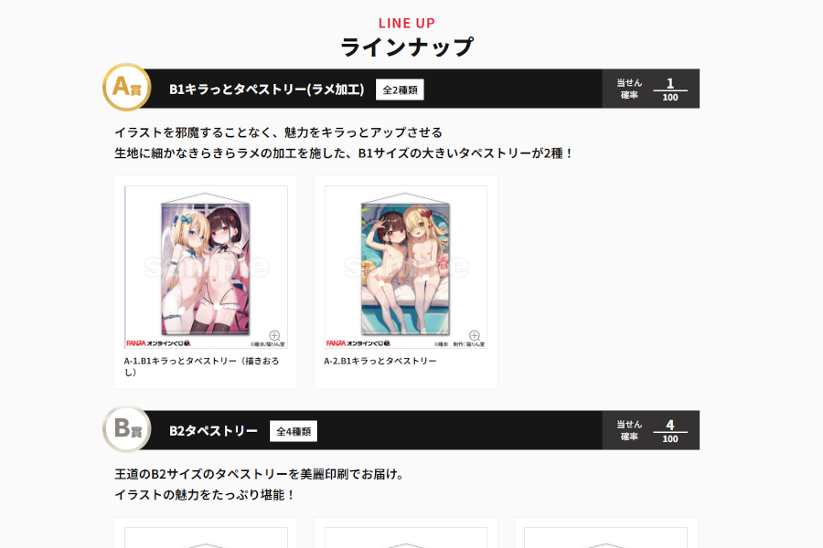 B賞はB2サイズのスエードタペストリー。B-3、B-4賞は猫りん堂さんでグッズ化されたイラストで既にタペはゲットしてますんで、ワタシ的にはB-2賞が当たると嬉しいところです💖