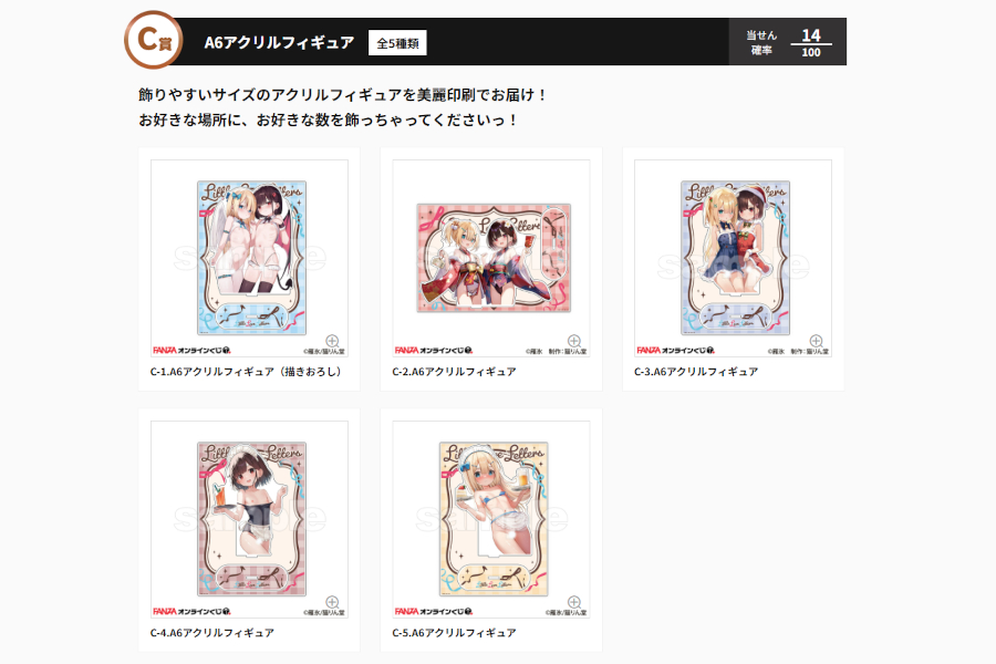 C賞はA6アクリルフィギュア。普段猫りん堂さんで販売されているアクリルフィギュアがA5サイズですんで一回り小さいものになりますね🐤C-1賞はA-1賞と同じ描き下ろし、C-4、C-5賞は猫りん堂さんでグッズ化されたイラストです。